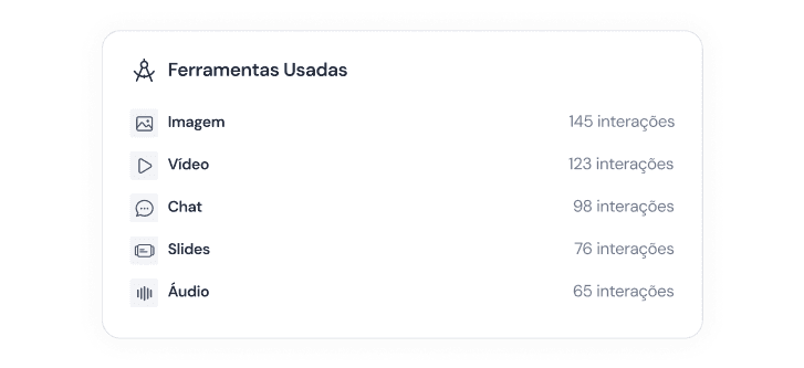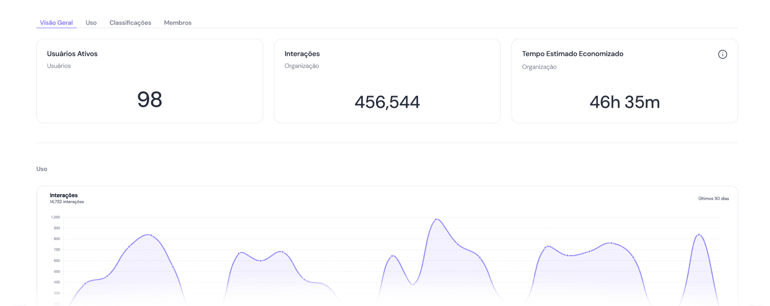 Acesso exclusivo a um painel personalizado com todos os insights importantes sobre o uso e engajamento de todos os seus colaboradores. Descubra quais as principais IAs e ferramentas que estão sendo usados para aumentar a produtividade e economizar horas de trabalho.